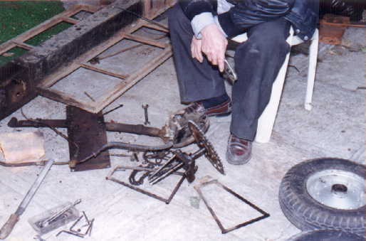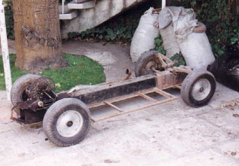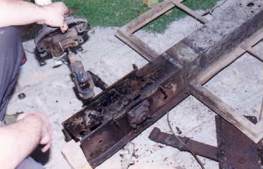 El chasis, se encontraba en muy mal estado y muy oxidado ya que está lleno de hoyos pues se le hicieron diversas adaptaciones de motor y suspensión, (no sé por qué razón), de hecho el chasis no sirve para nada, por lo que estamos pensando ponerle un chasis nuevo, o usar alguno de los que ya están restaurados. El motor se ubicó más de 10 cmts. por arriba de la base original con una placa de 5/16, esto ayudó a que el motor quedara más alto de lo normal, por ende y por no ponerle el tanque de gasolina en otra posición, les fue muy fácil romper la tapa de la cajuela haciéndole un saque para que no pegara la cabeza del motor y el tanque, que en ese lugar la verdad parecía más tinaco de agua que tanque de gasolina, también estaban modificadas la transmisión y cruceta (una sola), lo que no permitía el efecto de muelleaje, ya que para eso se necesitan 2 cardanes o crucetas y un estriado para lo que se alarga la flecha a la hora de trabajar la suspensión.
