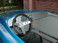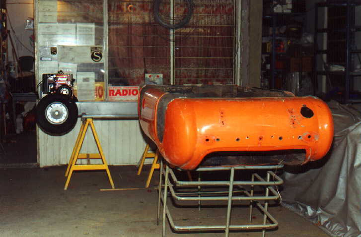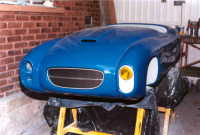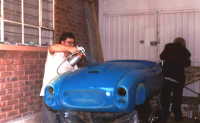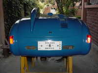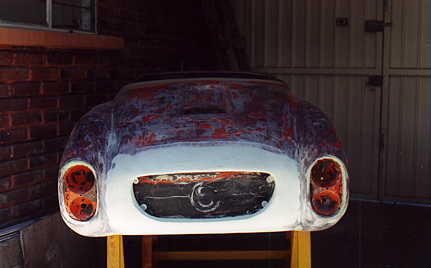 Al final se decidió hacerlo de carreras, ya que como tenía tanto ahujero (parecía queso holandés), era preferible hacerle las modificaciones y cegar el nefasto recorte de la tapa trasera y demás las conversiones inútiles y sin conocimiento de causa que tenía, (para que de esa forma quedara como es debido); lo primero que se hizo fue quitarle el espantosísimo color ANARANJADO CALABAZA DE HALLOWEN, y con ello pudimos ver que el color original era rojo, y el Gel Coat de la fibra de vidrio es negro, por lo que con esto confimó que fue el ultimo modelo de fibra de vidrio que se fabricó en 1959, (aunque se hiceron 2 más de lámina con Números de serie 7 y 8). Este auto como se menciona anteriormente se modificó a tipo Carrera, pues por lo lastimada de la carrocería se prestaba, además se decició pintarlo de color azul tipo Bugatti, ya que originalmente se hicieron 2 azules (el Nº 3 y Nº 5), así es que respetando los colores, se decidió usarlo.