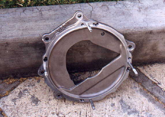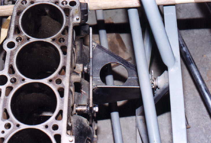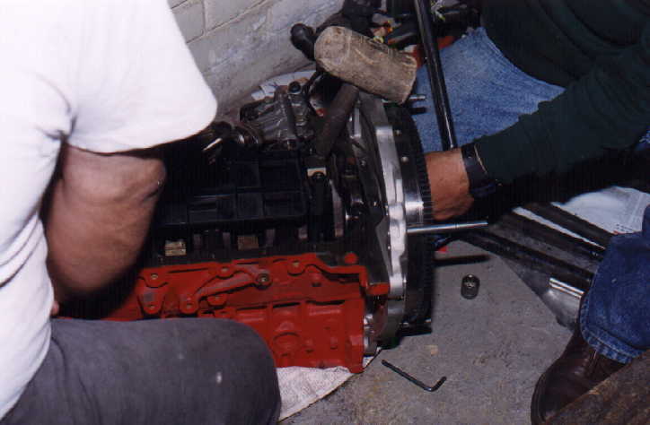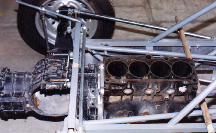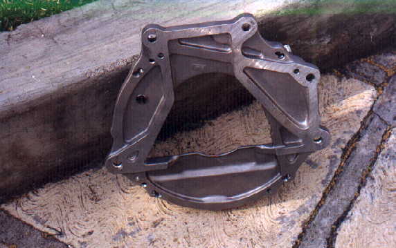 Estamos usando un motor de VW Golf y una caja de VW Sedán, (los volantes y clutch son distintos), entonces para poder adaptar un motor a una caja que no corresponde al mismo, hay que hacerle un adaptador especial y un volante especial, por lo que nos pusimos en contacto con la casa KENNEDY, quien nos ayudó a resolver ese problema, ya que ellos manufacturan en aluminio adaptadores y volantes con flanch de GOLF y base para disco de clutch de VOLKS WAGEN SEDAN, sólo que este adaptador además es diferente, ya que aquí la caja vá de cabeza (voltedada) a diferencia del VW Sedán, con otra cosa, el motor va inclinado 15 grados hacia la derecha (visto desde atrás).