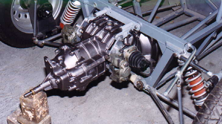 La caja de velocidades es de un Volks Wagen tipo sedán, sólo que tiene flanches para suspensión independiente en la parte trasera, este tipo de cajas se encontraban también en los VW SAFARI. Uno de los trabajos de adaptación más meticuloso e importante fue el de adaptar los discos y calipers a la caja (sujetos a la carcasa), ya que las mazas traseras no llevan los frenos, sino estos van en la caja (originalmente se usa en este tipo de coches, caja tipo HEWLAND), la cual ha sido hasta la fecha imposible de encontrar en México, por tal motivo, se uso una de VW, ya que la HEWLAND, usa Housing de VW (sólo que de cabeza, para que esta pueda ir muy baja y el coche quede cerca del piso muy chaparrito).