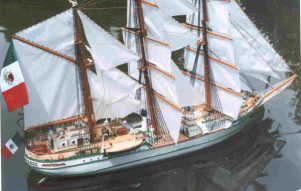 ![]() Esc. 1:78 ( 1.50 Mts. x 30 Cms. Altura Mástiles 1.07 Mts.) Reproducción del Buque escuela Bricbarca de tres mástiles "CUAUHTEMOC", de la armada de México. Construido en los astilleros Celaya, S.A. en Bilbao España y botado en 1982. Diseño, plano del modelo y construcción de Benito De Teresa (1999 - 2003) Este modelo fue realizado en base a fotografías del original y visita al buque en su base (Puerto de Acapulco Gro. México); siendo un modelo casi en su totalidad realizado en madera, con mucho trabajo y detalle, en el que se muestra amplia experiencia y conocimiento del arte del MODELISMO. Información del Buque Cuauhtémoc: http://www.semar.gob.mx/Velero/velero/phistoria.html