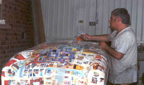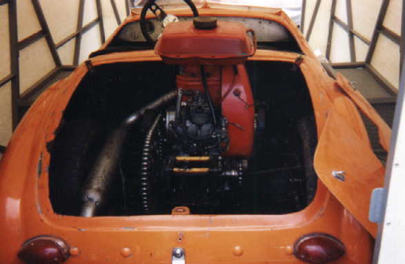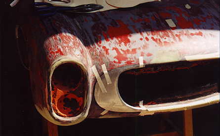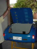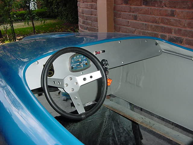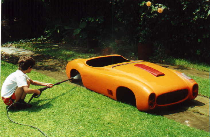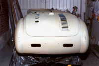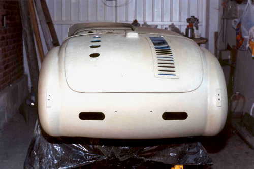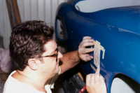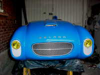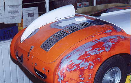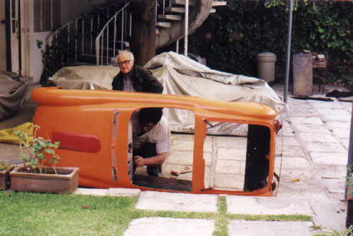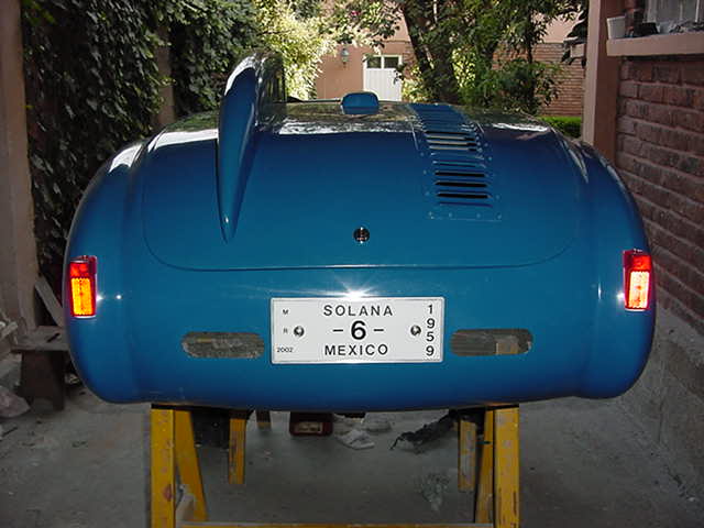 Al final se decidió hacerlo de carreras, ya que como tenía tanto ahujero (parecía queso holandés), era preferible hacerle las modificaciones y cegar el nefasto recorte de la tapa trasera y demás las conversiones inútiles y sin conocimiento de causa que tenía, (para que de esa forma quedara como es debido); lo primero que se hizo fue quitarle el espantosísimo color ANARANJADO CALABAZA DE HALLOWEN, y con ello pudimos ver que el color original era rojo, y el Gel Coat de la fibra de vidrio es negro, por lo que con esto confimó que fue el ultimo modelo de fibra de vidrio que se fabricó en 1959, (aunque se hiceron 2 más de lámina con Números de serie 7 y 8). Este auto como se menciona anteriormente se modificó a tipo Carrera, pues por lo lastimada de la carrocería se prestaba, además se decició pintarlo de color azul tipo Bugatti, ya que originalmente se hicieron 2 azules (el Nº 3 y Nº 5), así es que respetando los colores, se decidió usarlo.