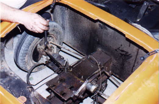 El chasis, se encontraba en muy mal estado y muy oxidado ya que está lleno de hoyos pues se le hicieron diversas adaptaciones de motor y suspensión, (no sé por qué razón), de hecho el chasis no sirve para nada, por lo que estamos pensando ponerle un chasis nuevo, o usar alguno de los que ya están restaurados. El motor se ubicó más de 10 cmts. por arriba de la base original con una placa de 5/16, esto ayudó a que el motor quedara más alto de lo normal, por ende y por no ponerle el tanque de gasolina en otra posición, les fue muy fácil romper la tapa de la cajuela haciéndole un saque para que no pegara la cabeza del motor y el tanque, que en ese lugar la verdad parecía más tinaco de agua que tanque de gasolina, también estaban modificadas la transmisión y cruceta (una sola), lo que no permitía el efecto de muelleaje, ya que para eso se necesitan 2 cardanes o crucetas y un estriado para lo que se alarga la flecha a la hora de trabajar la suspensión.